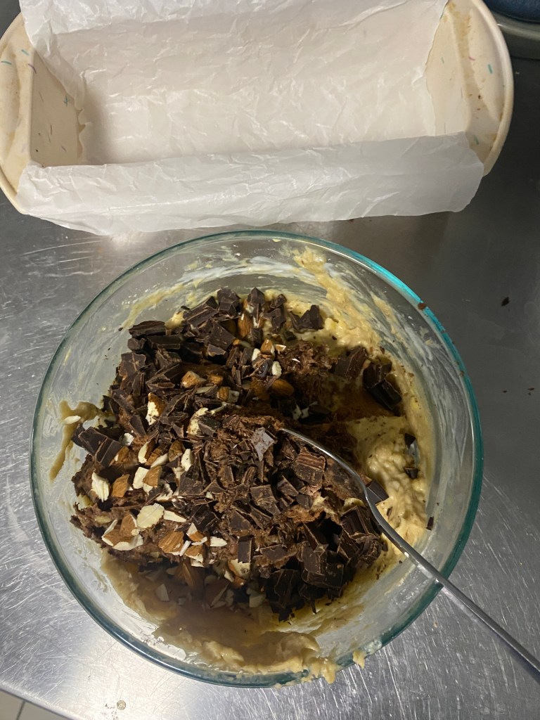 - Add in the sugar, cinnamon, choc chips & almonds