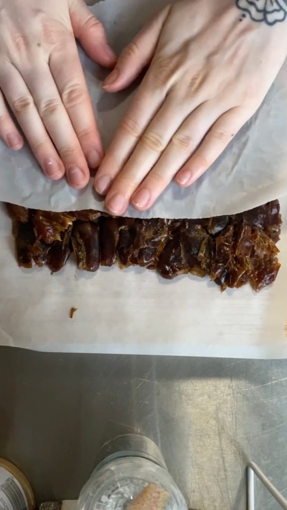 - Lay another baking sheet on top and press down to flatten the dates. This also helps them stick together a little
